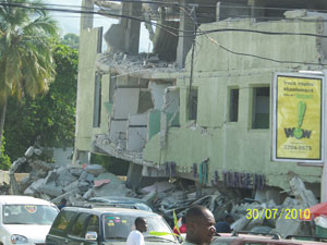 Rubble-filled street in Port au Prince | Crumbling building in Port au Price |