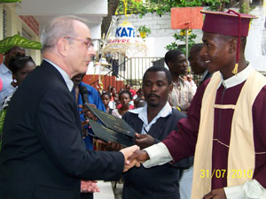 I have just returned from Haiti after attending the 2010 Timkatec 2 graduation. On July 31st the 61 graduates of the trade training school started a new life. Amidst the total devastation of the earthquake, this was a shining example of the success that can occur in Haiti even in these desperate times. I was accompanied by Tommy Stinson, current bass player for Guns’n Roses and Soul Asylum and a founder of the Replacements, who has committed to some long support of Timkatec, and Mike Spinelli. Tommy had contacted me a few months ago to assist us in raising funds for our "street children". His website I now linked to ours, and he will be auctioning off band memorabilia to support us. This trip, in the midst of the rubble, was a great success and we saw what can be done by private means, as government organizations seem to crawl towards solutions.