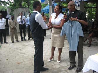 Father Simon and a local supporter congratulate the 2011 Laureate |