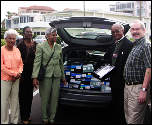Shoes purchased for the Children of Timkatec by the Friends of Timkatec and All Souls Parish, Sanford Florida, being presented to CRS' Dula James, Sabine and Marie Manigat, and Fr. Simon, February 2006 |
